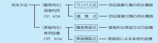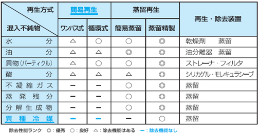 フルオロカーボンの再生には、表1に示す様に、現場で手軽にできる簡易再生と新品に近い品質になる蒸留再生の二通りがあります。