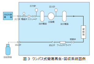 現場でできる再生は簡易再生で、回収した冷媒を油分離器、フィルタドライヤを通して、油分、水分、酸分、パーティクルなど混ざった不純分を物理的に取り除く方式です。