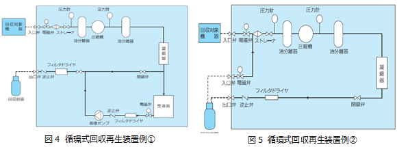 回収冷媒を、フィルタドライヤを循環させて再生度合いを高めるように配慮した方式です。内蔵の受液器にまず回収して、 循環ポンプで循環浄化する浄化サイクルを持つ方式(図4)や、回収冷媒を回収サイクル中に配備されている油分離器、 フィルタドライヤを通過させて容器に回収しますが、電磁弁の切替で再生回路になり回収容器内の冷媒を再度循環再生できる方式(図5)などがあります。