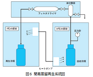 簡易蒸留再生は、回収冷媒を一度気化させ,再度液化させることで不純物を除去する再生方式です(図6)。 蒸留精製式に比べ性能は劣るが,油分離,冷媒に混入した空気(非凝縮ガス)の除去は可能です。 この簡易蒸留再生で再生した冷媒は、再生前の品質により再生後の品質に影響がでることがあり、 純度の高い受入冷媒を選定して再生することで,再生を行うことができます。